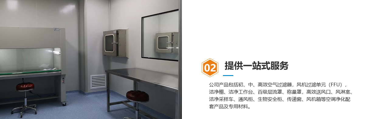 我們公司產品包括初、中、高效空氣過濾器,風機過濾單元(FFU),潔凈棚、潔凈工作臺、百級層流罩、稱量罩,高效送風口、風淋室、潔凈采樣車、通風柜、生物安全柜、傳遞窗、風機箱等空調凈化配套產品及專用材料。